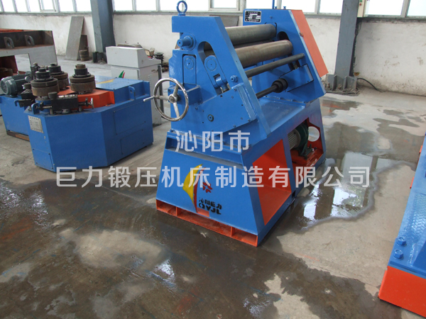 The structure of the three-roller asymmetrical plate winder is three-roller asymmetrical, the upper roller is the main driving roller, and vertical lifting motion is made at the central symmetrical position of the two lower rollers. It provides torsion force for the rolled sheet and acts as the main drive. The side roll is inclined to lift and has the dual functions of pre-bending and rolling, compact structure and convenient operation and maintenance.