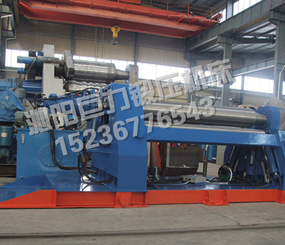 該四輥卷板機與對稱三輥卷板機比較,它可以不借助其它設備模具,直接予彎板材端部,而且剩余直邊較小;它可以不使板材調頭,而卷成工件。