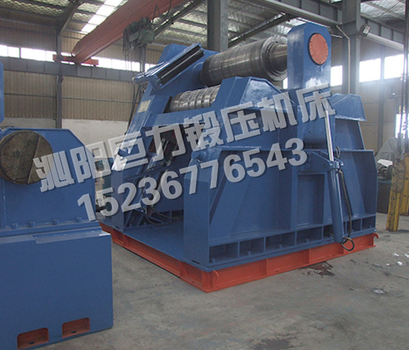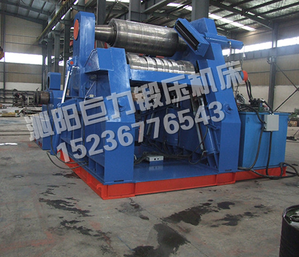 該四輥卷板機與對稱三輥卷板機比較,它可以不借助其它設備模具,直接予彎板材端部,而且剩余直邊較小;它可以不使板材調頭,而卷成工件。